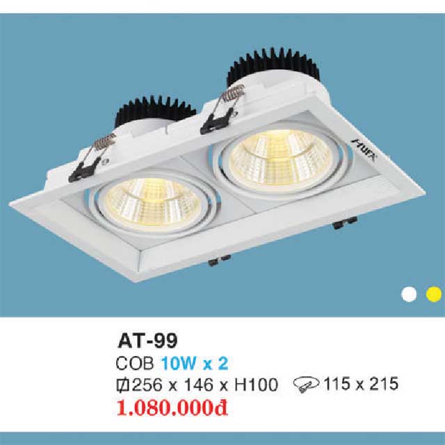 Đèn led âm trần đôi AT-99 là sự kết hợp của 2 bóng âm trần nhỏ hơn nhằm tăng cường độ sáng mạnh mẽ hơn so với bóng đơn thông thường. Đòng đèn này thường được sử dụng trong chiếu sáng văn phòng, cửa hàng, những nơi cần mật độ sáng cao. Với những dòng âm trần đôi chiếu rọi chúng còn giúp tạo điểm nhấn trong không gian và làm nổi bật vật thể trong không gian đó.